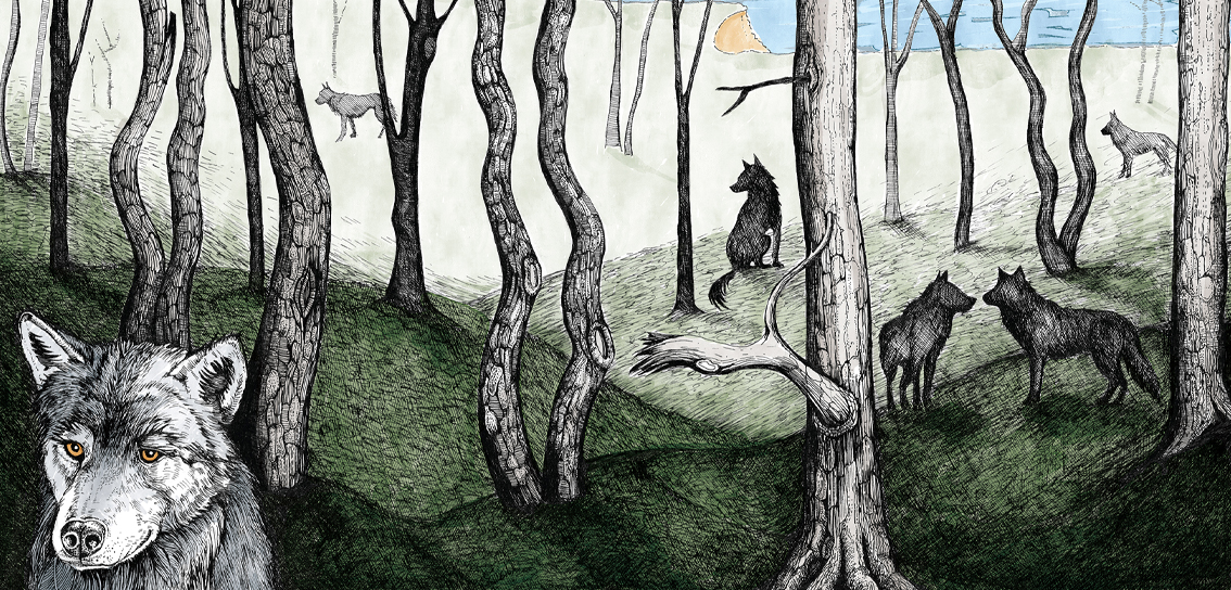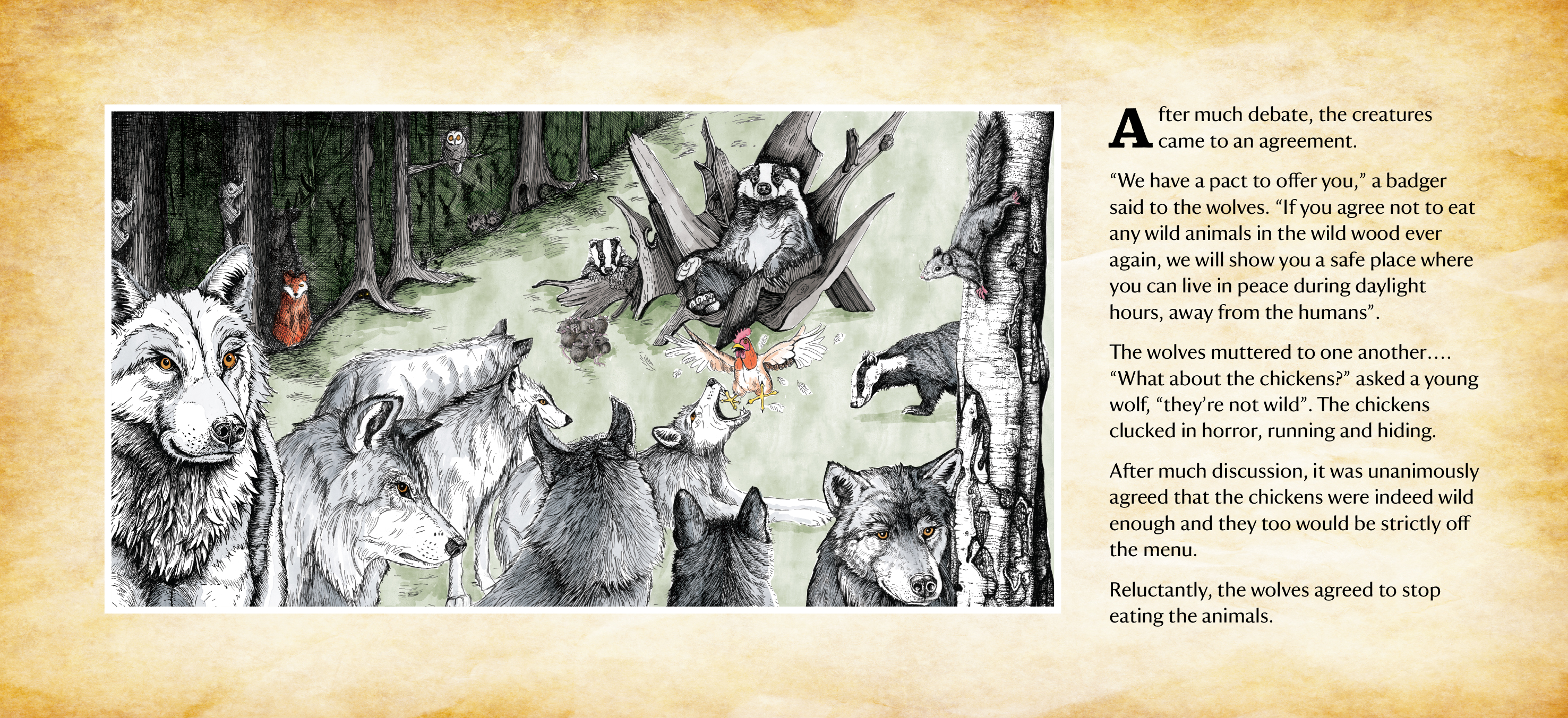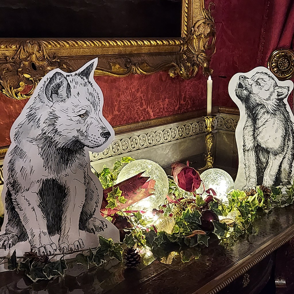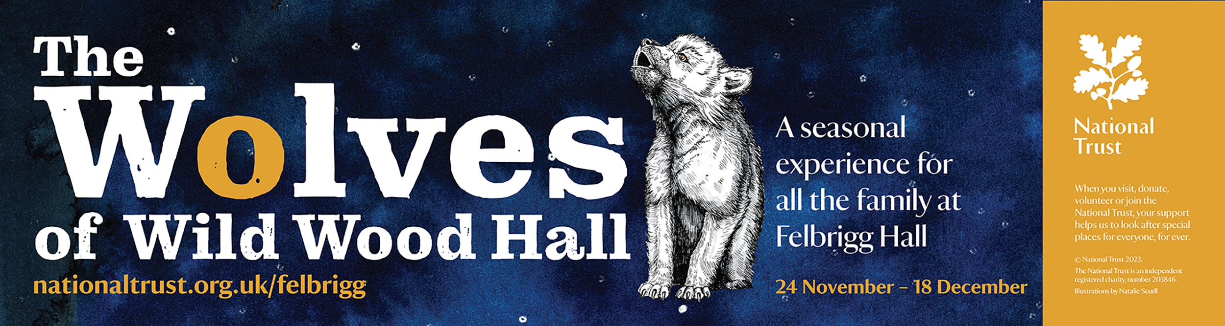 Felbrigg Hall’s 2023 family Christmas event, The Wolves of Wild Wood Hall, offered visitors an indoor story trail through the Hall’s seasonally decorated ground floor. I was commissioned to illustrate the story of a pack of wolves living in tunnels under the Hall. Each page of the story was reproduced as a large graphic and displayed along the trail route. In addition, I illustrated wolves and woodland creatures to be used as life size cut-outs nestled in amongst the decorated rooms. I designed and printed the accompanying posters, flyers and banners used to promote the event.